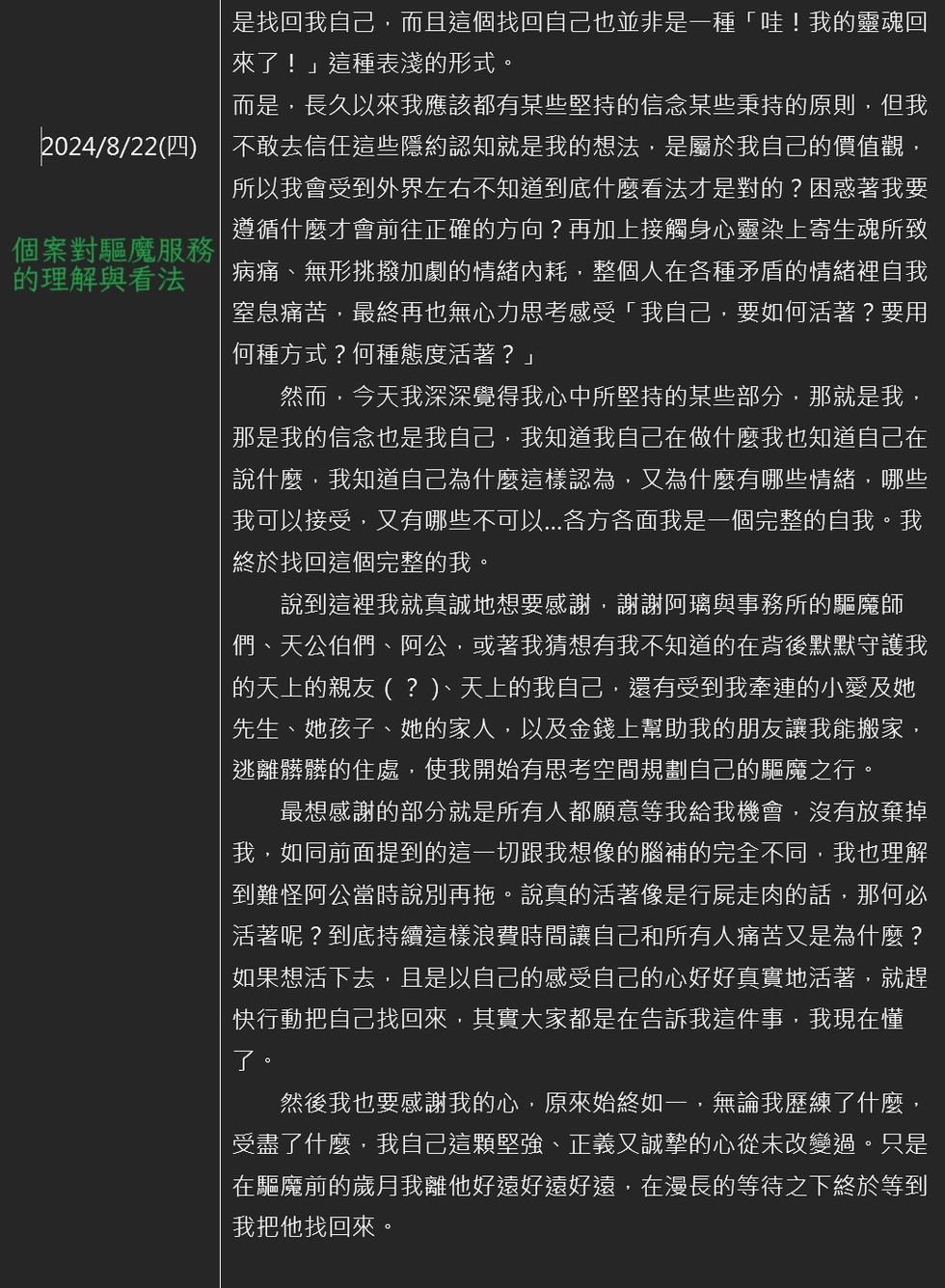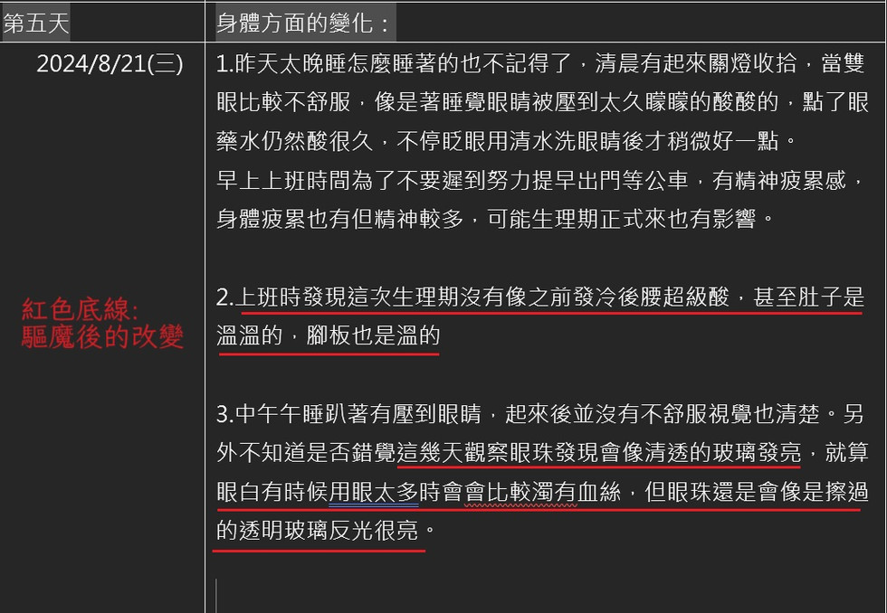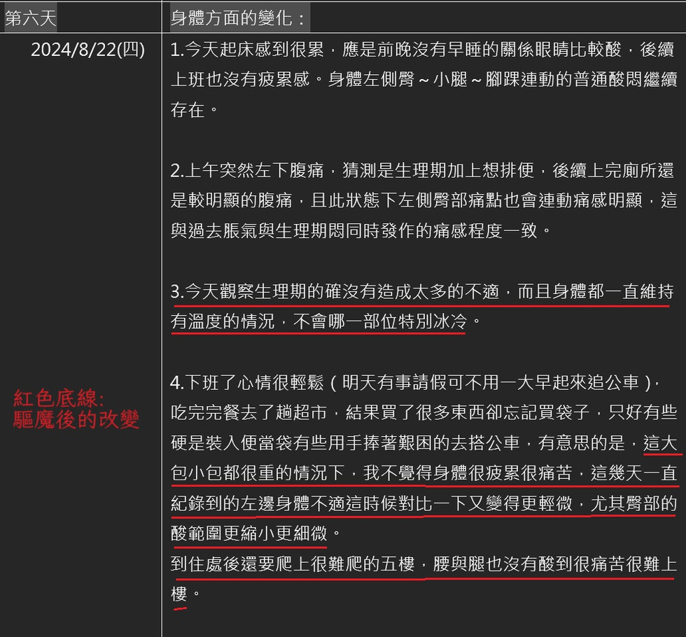 以下是她的驅魔後的七日紀錄,我覺得挺驚心動魄的,一起來看看吧!