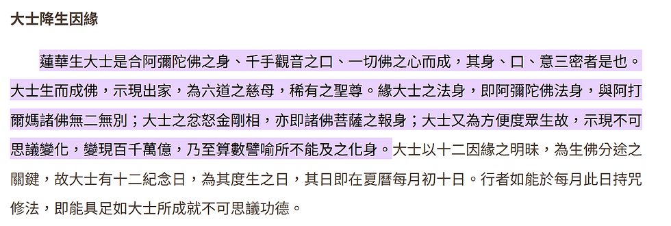 只要編造出一個身世跟佛祖相似經歷的人,再說蓮花生大士是受教於阿難尊者,也直接領受佛祖的教義、精通顯密雙宗與當時的政權加持(藏王赤松德贊的尊崇)、用性暴力手段整合當地信仰提高藏傳佛教的傳教效果,蓮花生大士被視為佛陀的「化身」便更合情合理。